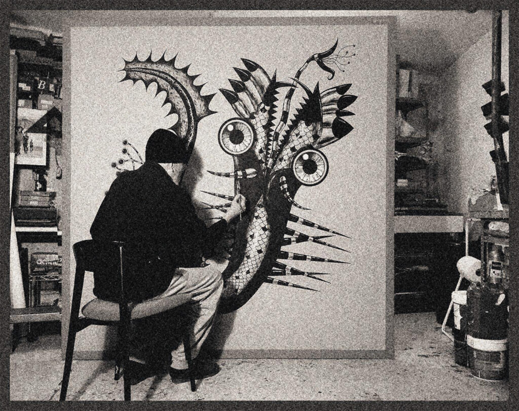 Unos bichos, «agrupados en series de BESTIARIOS, y que en esta última que ahora se exhibe en esta muestra inédita, y que sirve de homenaje al artista, se incluyen piezas de gran formato, de 200 x 200 cms., realizadas en fondos lisos, cada una de un color, mientras que los bichos pintados han sido realizados con pintura negra, como único elemento gráfico pictórico sobre esos fondos, otorgándoles así pleno protagonismo. Son una suerte de divertidos animales, que a pesar de sus cuerpos llenos de púas, pinzas, punzones, quebradas patas, cuernos, ojos saltones, agrandados, a veces cuádruples, hocicos punzantes o tentáculos, bocas dentadas y aceradas púas, no nos amedrentan, a pesar de sus miradas desafiantes y penetrantes, nos parecen tiernos e inofensivos, un poco bravucones pero divertidos, de inocentes imposturas que son más pura pose que agresividad de fondo. Unos bichos, algo punkis, que se metamorfosean y fusionan en sus cuerpos con fragmentos corporales de unos y otros, traspasando la categorización de especies, en una suerte de surreal configuración. Y que, a pesar de sus apariencias retonas, son de una tierna ingenuidad, y parecen querer comunicarse con nosotros, como, a veces, ocurre en la vida misma, donde humanos retones, insolentes, descarados y de apariencia autocomplaciente y distante ocultan, bajo estas poses, que son como máscaras defensivas, sus verdaderas vulnerabilidades».