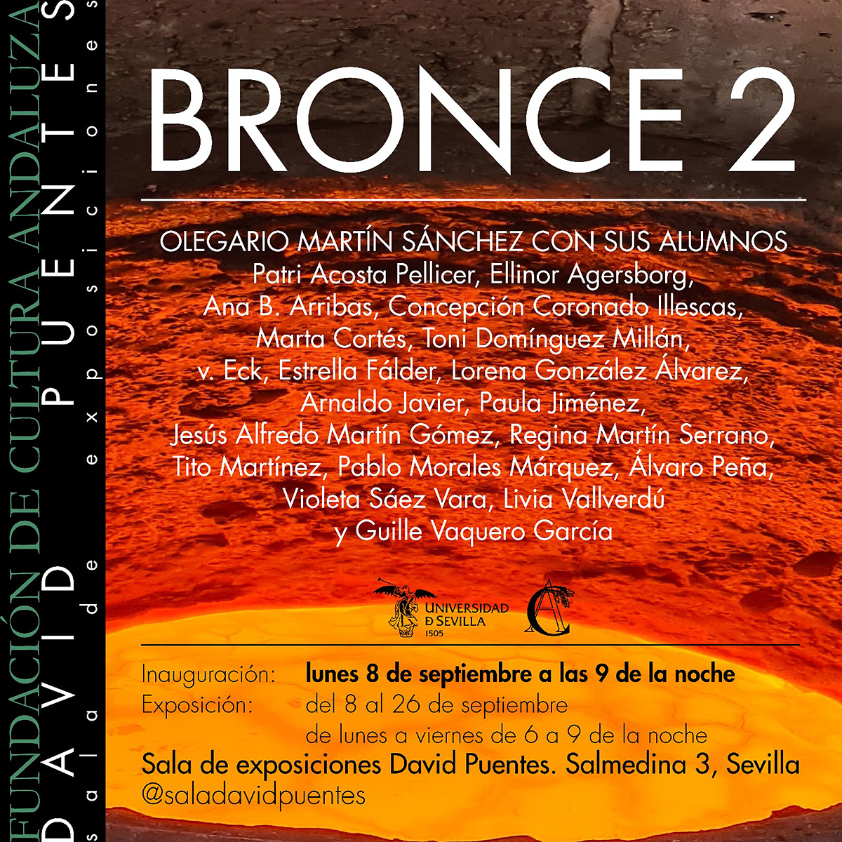 La Fundación de Cultura Andaluza, en colaboración con la Facultad de Bellas Artes de Sevilla, inaugura el próximo lunes 8 de septiembre a las 21:00 horas, en su sala de exposiciones David Puentes (C/ Salmedina, 3), «Bronce 2».