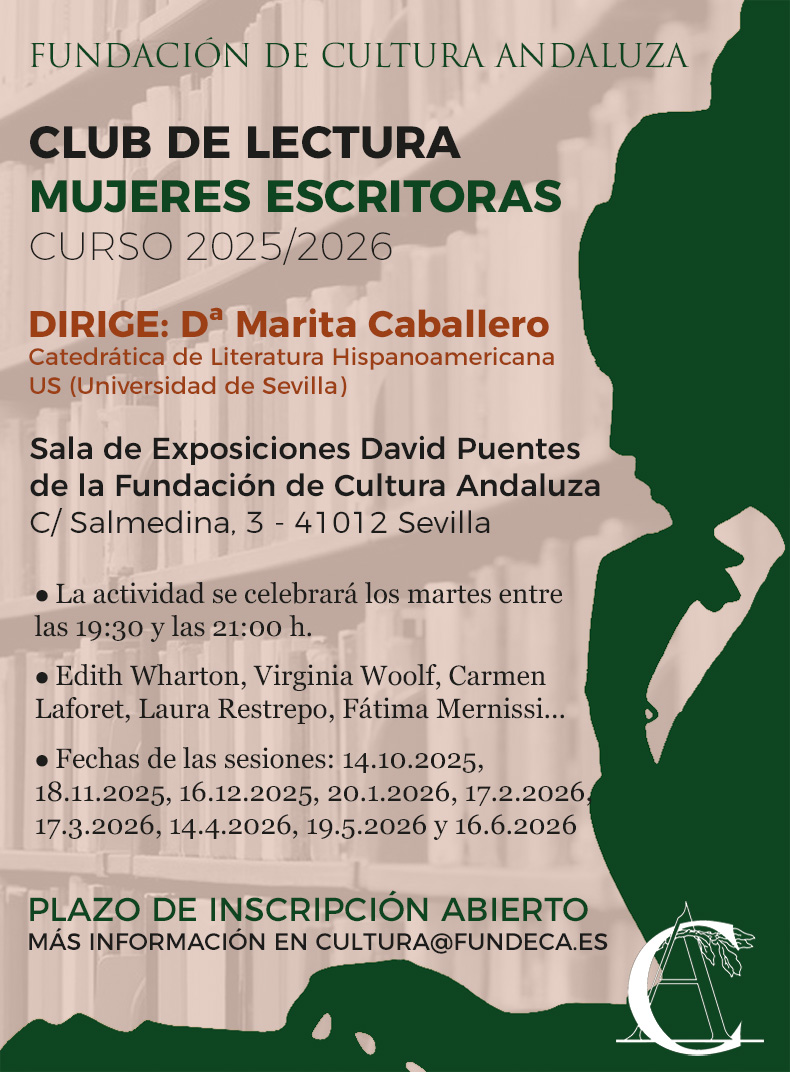 Como actividad paralela al Club de Lectura, la Fundación de Cultura Andaluza inaugura en este curso 2025/2026 su seminario «Mujeres escritoras», dirigido por Marita Caballero, Catedrática de Literatura Hispanoamericana en la Universidad de Sevilla (US). La actividad, que se encuadra igualmente dentro del «Foro de iniciativas culturales», motivará a los asistentes a comentar e intercambiar opiniones sobre una misma obra literaria, escrita por una mujer, que hayan leído previamente.