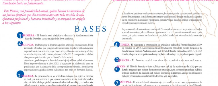 Está dirigido a destacar la fundamentación ética del Derecho como anclaje de las leyes positivas. Busca al mismo tiempo homenajear a D. Ángel Olavarría, prestigioso notario sevillano, primer secretario de esta Fundación y patrono hasta su fallecimiento, que dio testimonio durante toda su vida de un comportamiento profesional y humano intachable.